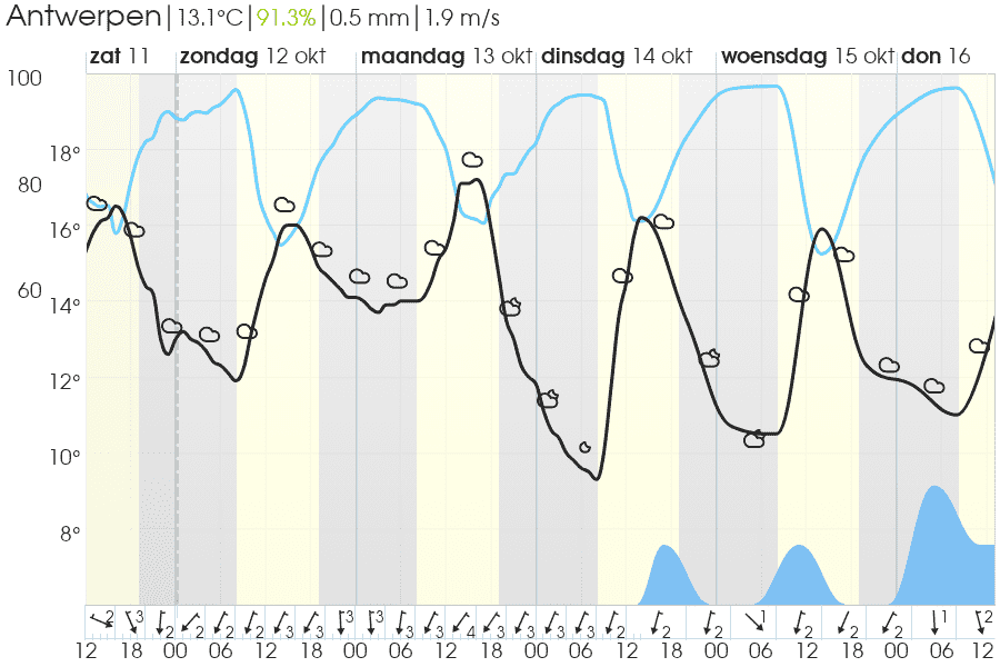 Bovenstaand een meteogram van Antwerpen, hij laat de temperatuur, luchtvochtigheid, neerslag en windrichting zien voor de komende dagen.